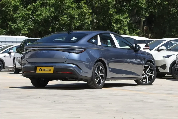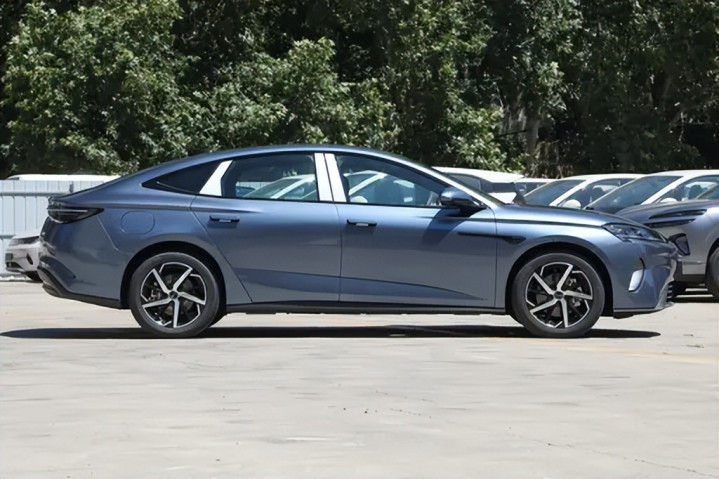 侧面是海豹07 DM-i最能体现优雅气质的部分。溜背式车顶线条平滑过渡至车尾,不仅增强了动感,也兼顾了风阻优化。车窗边框采用亮黑饰条勾勒,配合多辐式双色18英寸铝合金轮毂,整体视觉效果沉稳而不张扬。车门下方微微内收的腰线处理,让侧面在光影映射下层次分明,既有力量感又不显臃肿。新增的“云海灰”车身配色成为亮点,这种细腻的金属漆在阳光下能呈现微妙的渐变效果,比普通灰色更具高级质感,同时具备良好的耐脏属性。